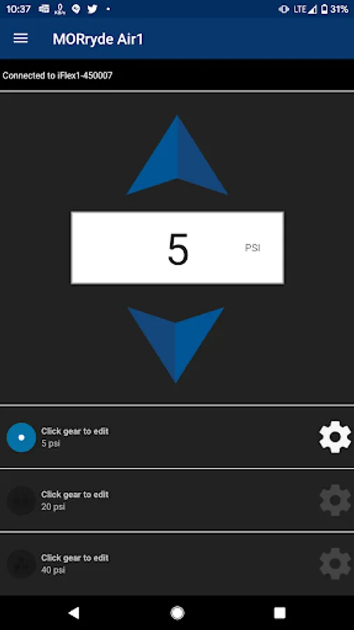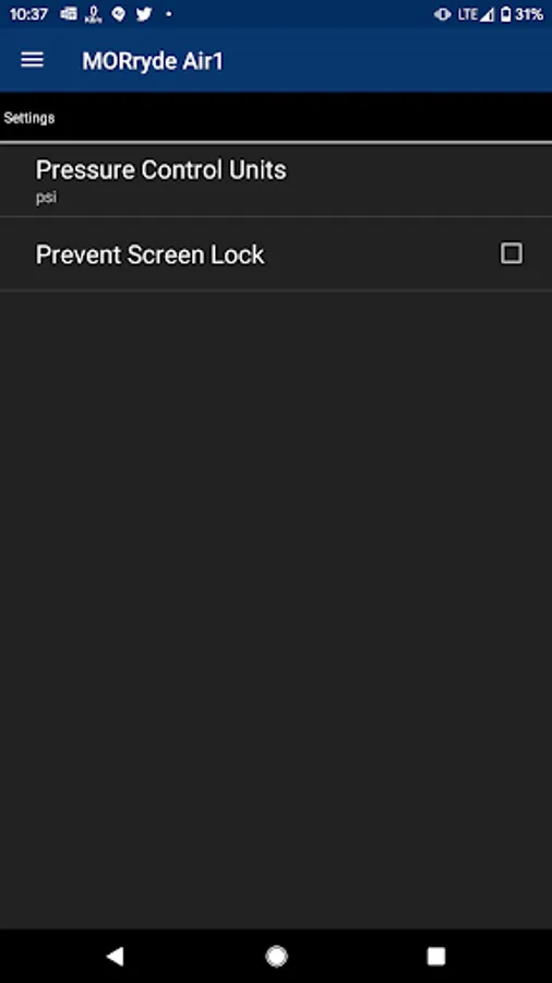 With the MORryde Air1 app you can control and monitor your air suspension equipped towable. Control the target air pressure setpoint, receive over the air firmware updates, and check and clear device diagnostics.