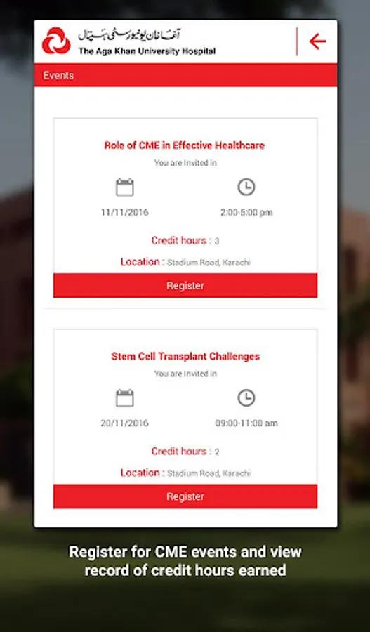 - Register for CME events and track credit hours (Require registering as a Physician first on AKUH mobile app to use this feature)