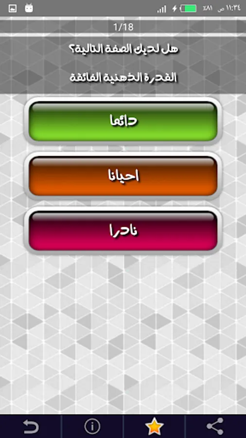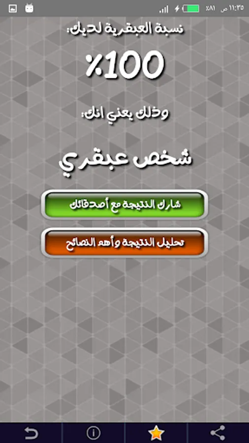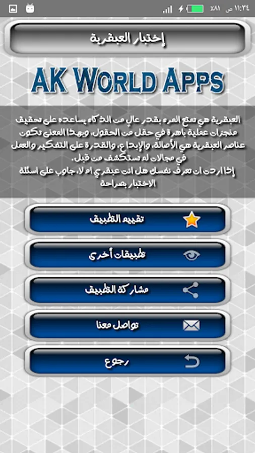 Hello all, we share with you a new application that is a distinct test that determines the degree of genius, answer the following questions and the program will determine your genius percentage and give you the best advice to increase your genius.