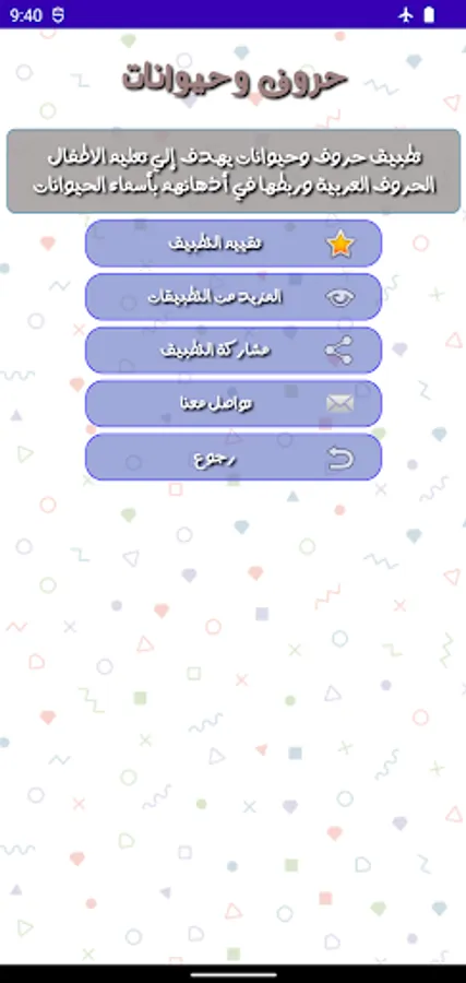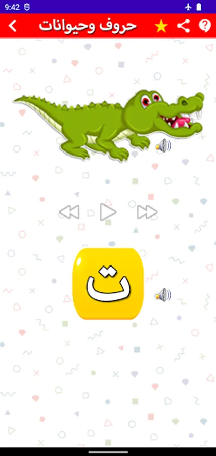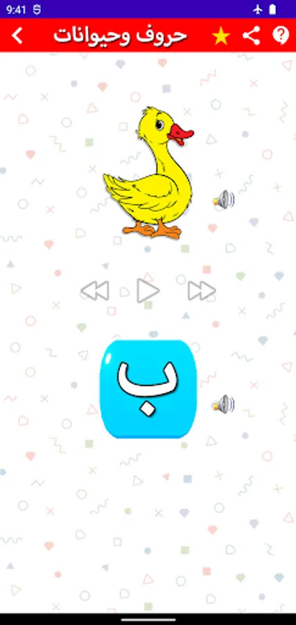 The application contains all the letters of the Arabic language in order, when you click on any letter, it is displayed with an example of an animal name that begins with the same letter, all supported with attractive pictures for the child's eyes.