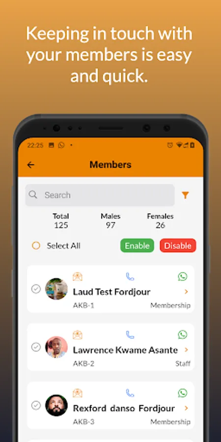 Need an effective solution to manage your staff/membership data, track attendance, communicate, collect fees and more? Subscribe on Akwaaba for all your HR solutions. It's reliable, secure, affordable and user-friendly, and comes in web, android and iOS platforms. The attendance system is location sensitive, making it impossible for users to clock outside of the meeting premises. User mobile device cannot be used to clock unless it has been approved. Option to create and assign users to meetings at multiple locations. Admin can filter absentees, attendees, late comers etc. Option to apply for leave/excuse. Option to update users’ profile, create and assign users to groups, unique IDs, filter and download data in excel/pdf. Send bulk SMS and Voice call to all or targeted groups and receive feedback. Users can make payment into organization's bank account via Mobile Money / Card / USSD with option to track defaulters etc. Contact us via info@akwaabasolution.com, whatsapp +233206007255.