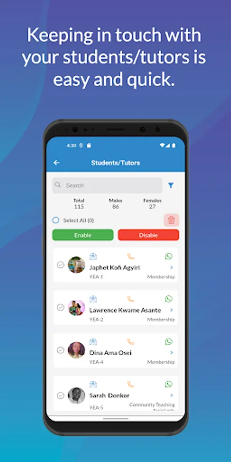 EDUCARE also comes with an integrated bulk sms and voice messaging solution for effective communication with parents and students. Parents can call or WhatsApp their wards' teacher on the app.