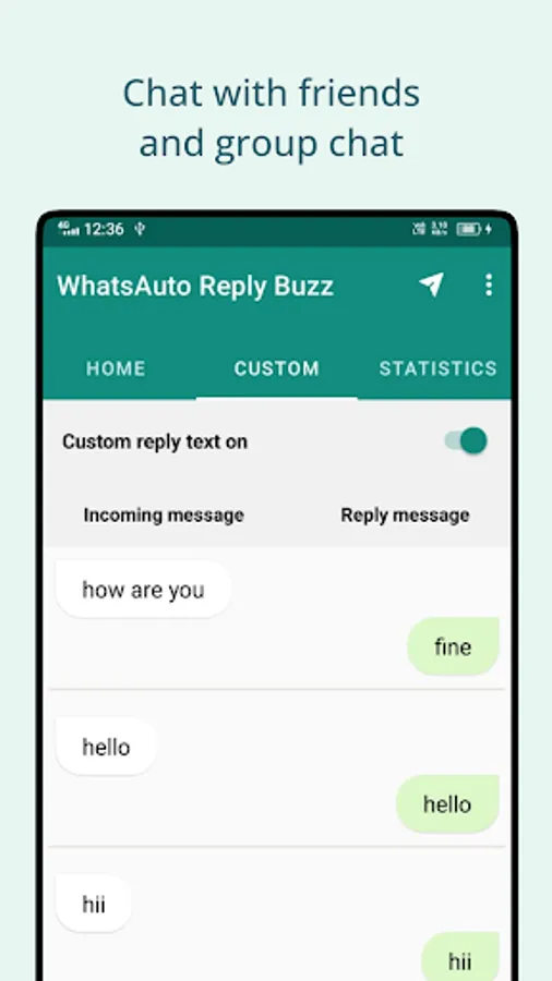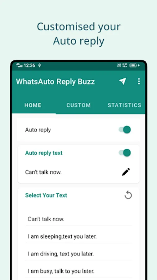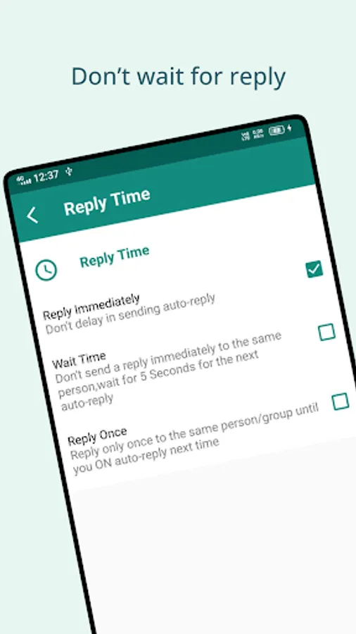 Customise the reply time. You can set WhatsAuto to send auto reply continuously or to send after some time delay or to send only once.