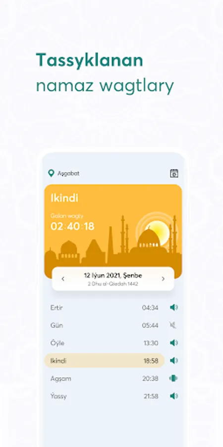 "Namaz wagty" is an application that offers complete information about the schedule of prayers in Turkmenistan, the location of mosques in cities, as well as the Muslim Hijri calendar, Tasbiha, Namaz book and Qibla compass.