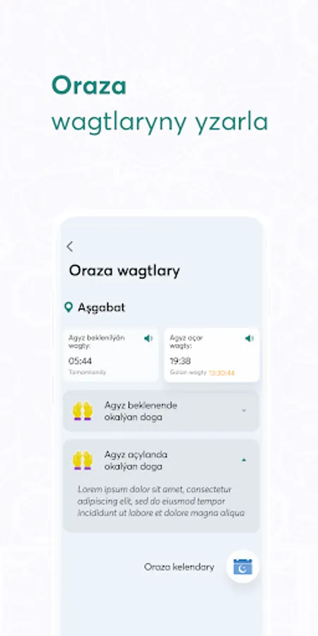 •Oraza aÿynda agyz beklemek we agyz açar wagtlary (Imsak we Iftar);