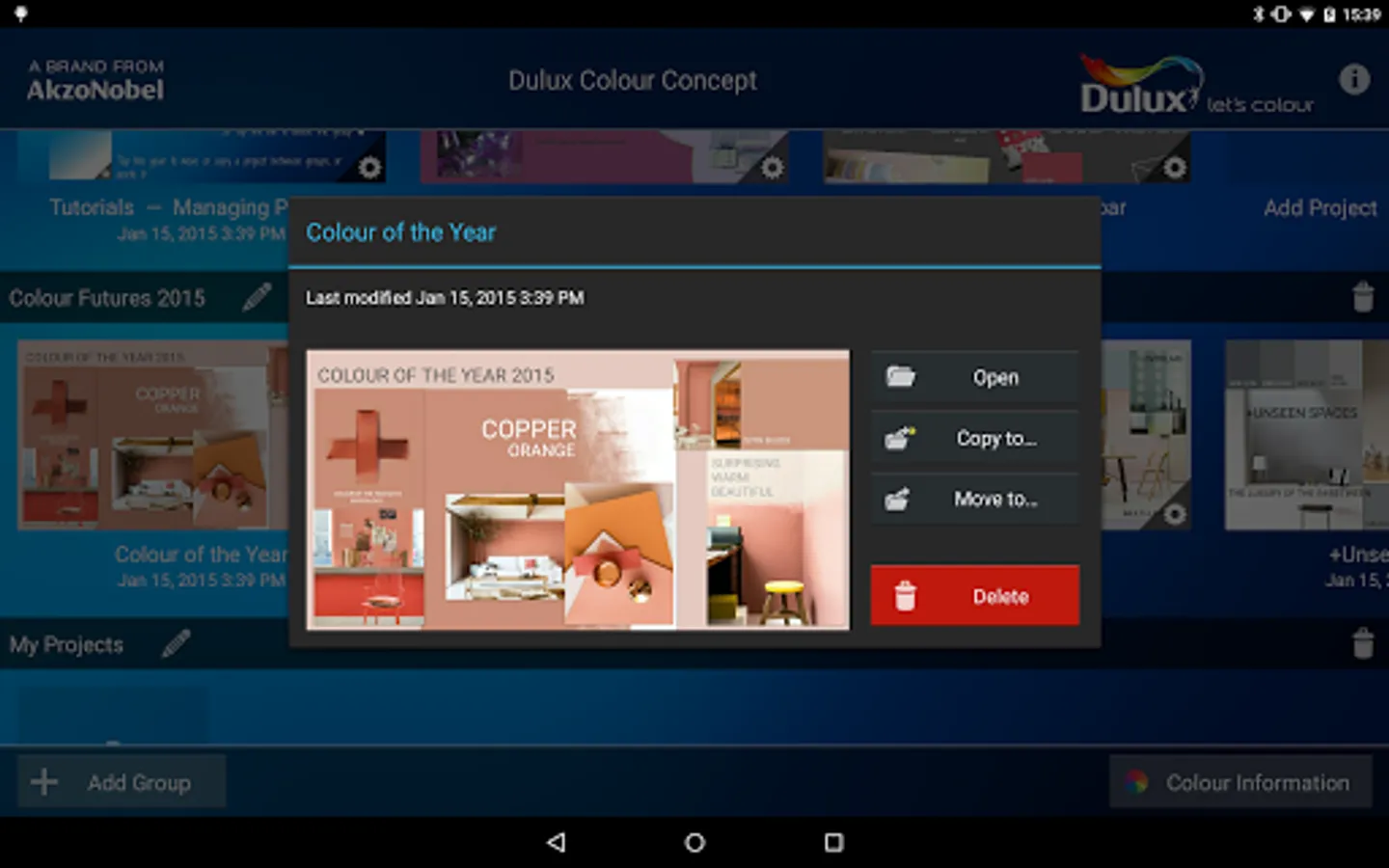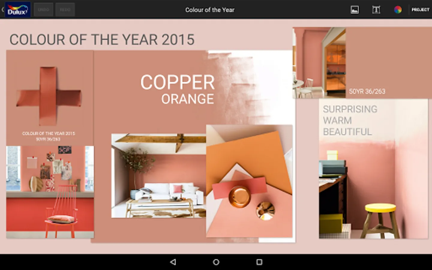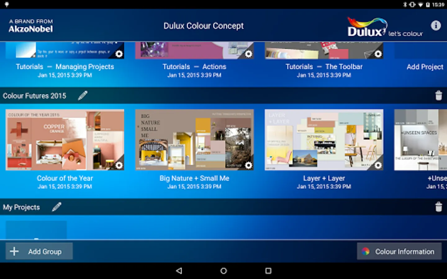 The app includes 'Colour Futures 2015', our colour trend research for the upcoming year. This provides global style and design trends which are translated into colour palettes for use worldwide.