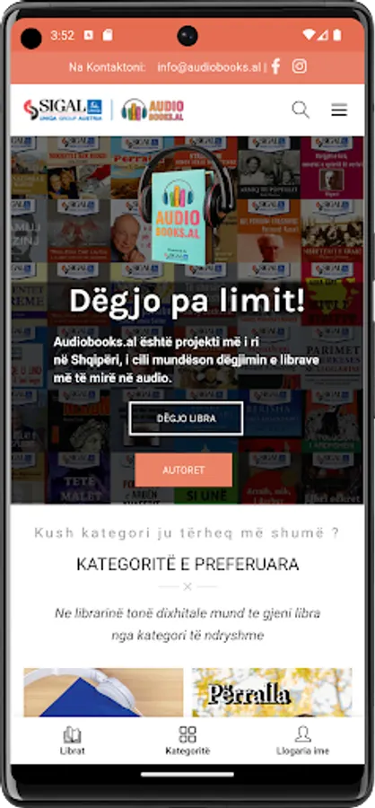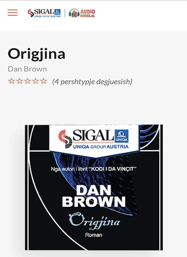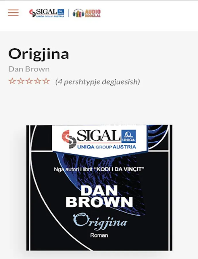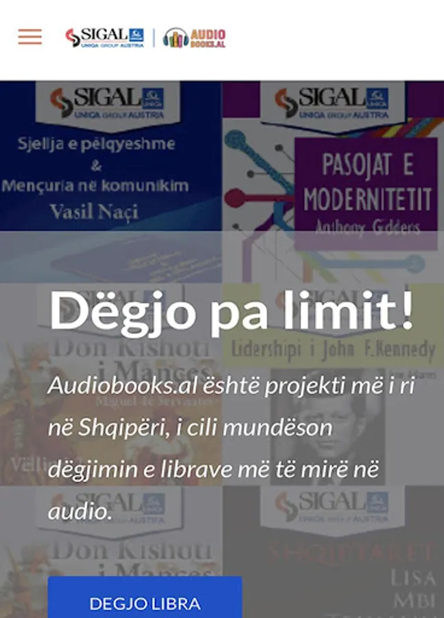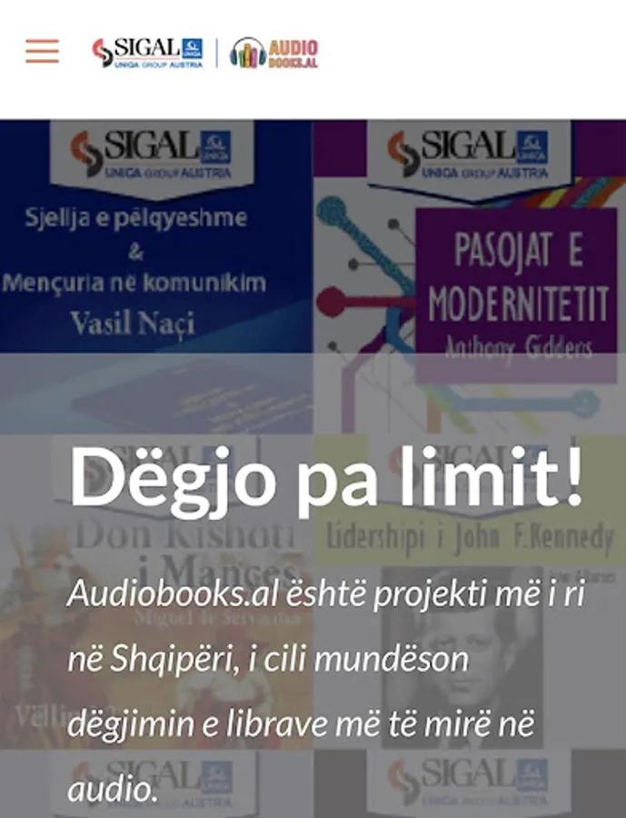 SIGAL Audiobooks.al është projekti më i ri në Shqipëri, i cili mundëson dëgjimin e librave më të mirë në audio. Autorët më në zë të huaj dhe shqiptarë janë përzgjedhur për dëgjuesit e të gjitha grupmoshave.