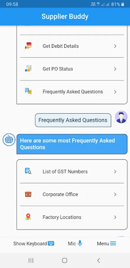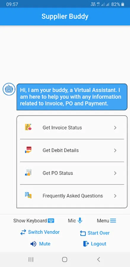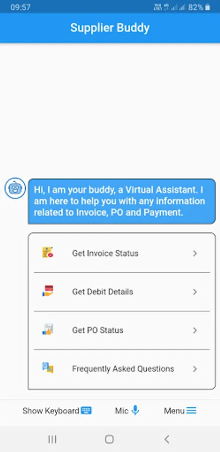 Supplier Buddy" is a Virtual Assistant (BOT) built by Ashok Leyland to help our Suppliers with real time information related to Invoice status, Payment details, debit note information and purchase order details. This will also help our suppliers to know the state wise GST Numbers and address of their respective delivery locations. Suppliers can register their mobile with their respective purchase officers of Ashok Leyland and can start interacting with their Buddy.