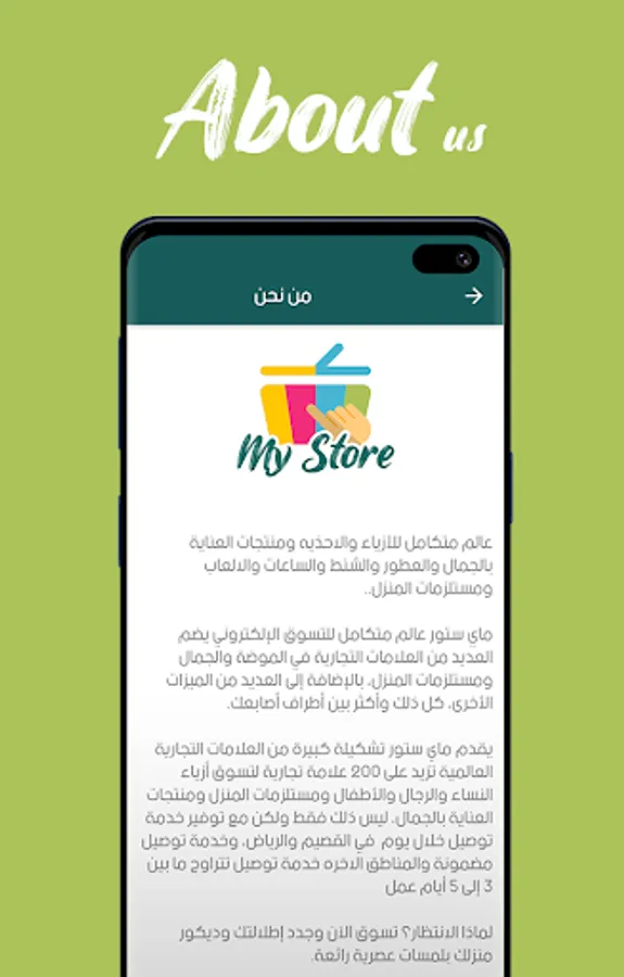 ماي ستور عالم متكامل للتسوق الإلكتروني يضم العديد من العلامات التجارية في الموضة والجمال ومستلزمات المنزل، بالإضافة إلى العديد من الميزات الأخرى، كل ذلك وأكثر بين أطراف أصابعك.