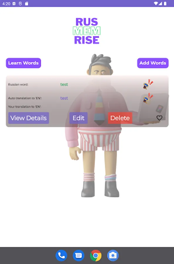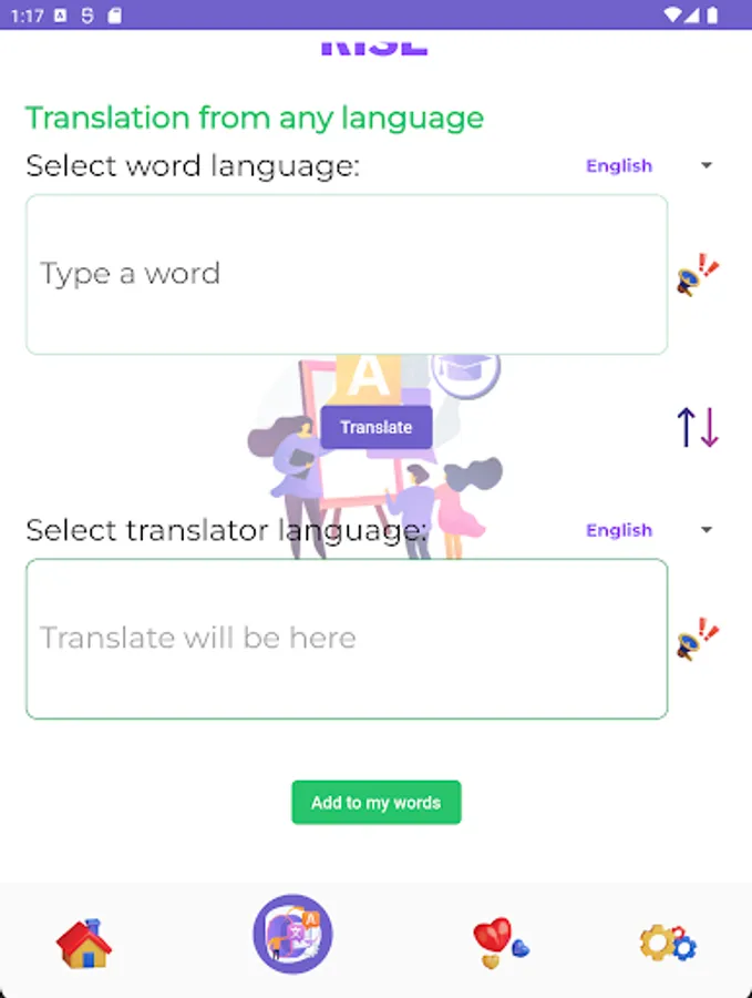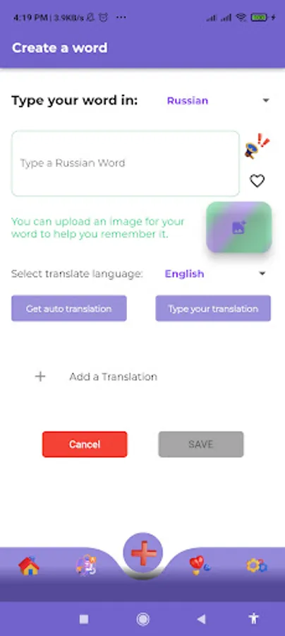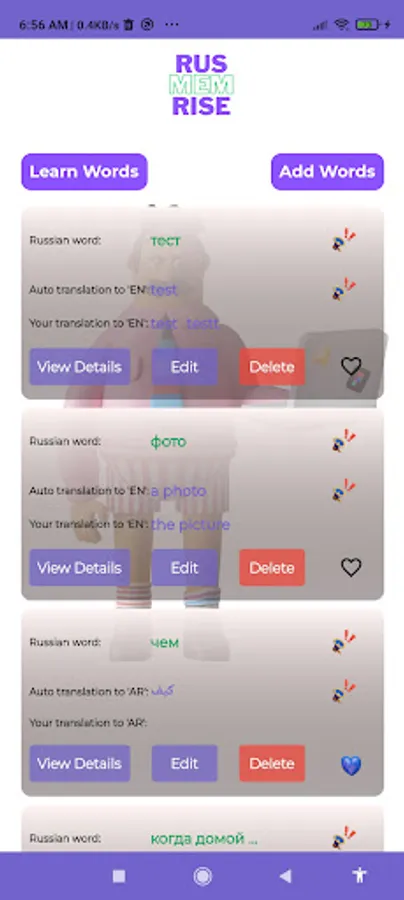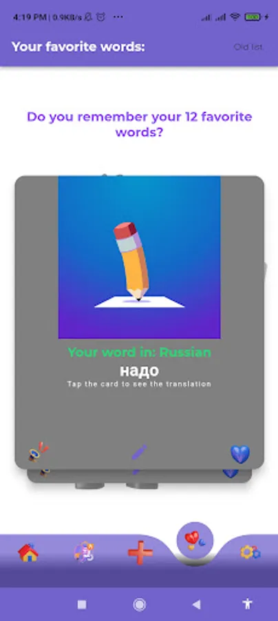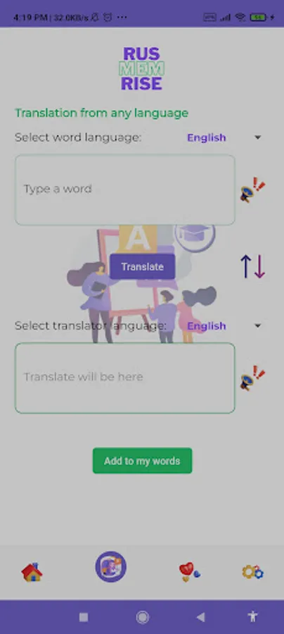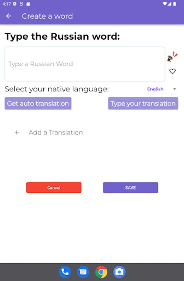 Add your own words and the translation, use an automatic translation, and repeat the phrase as you would in a notebook. It's a quick and simple way to save every word you write in one place.