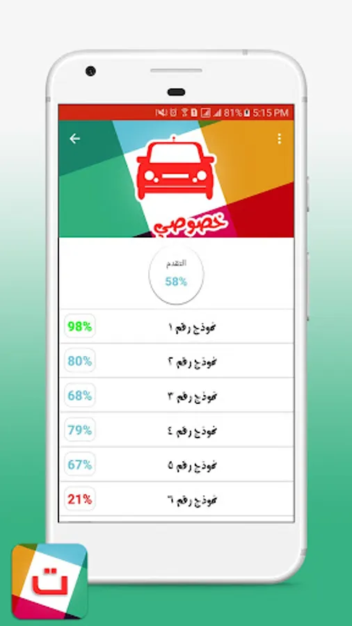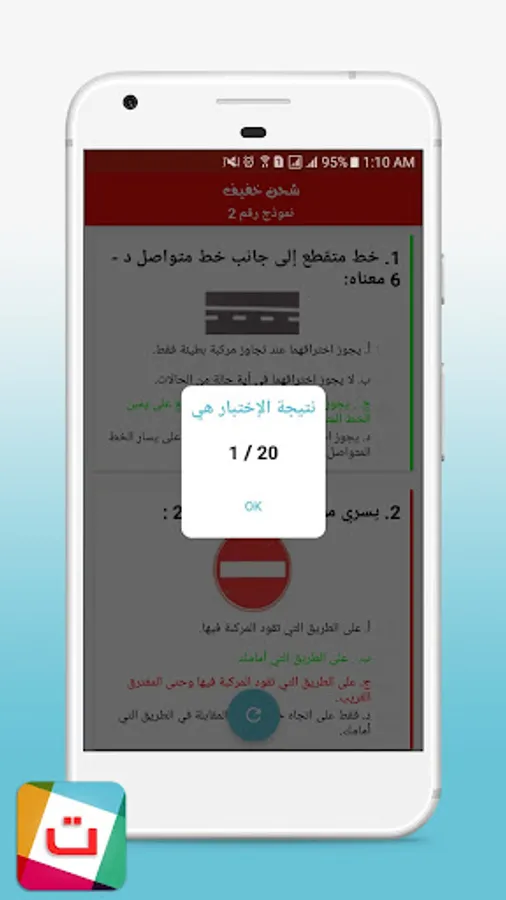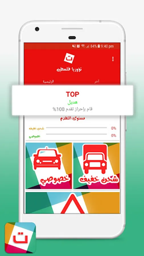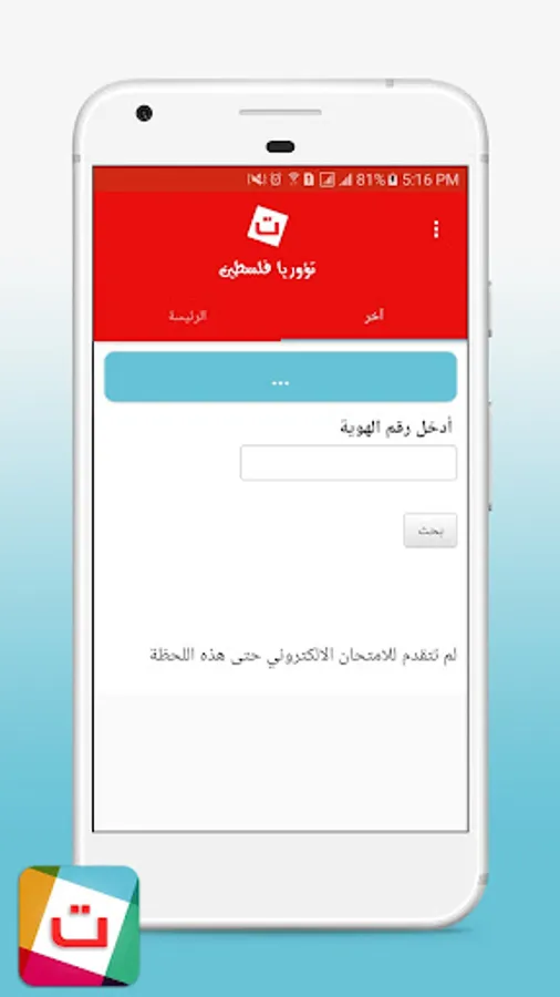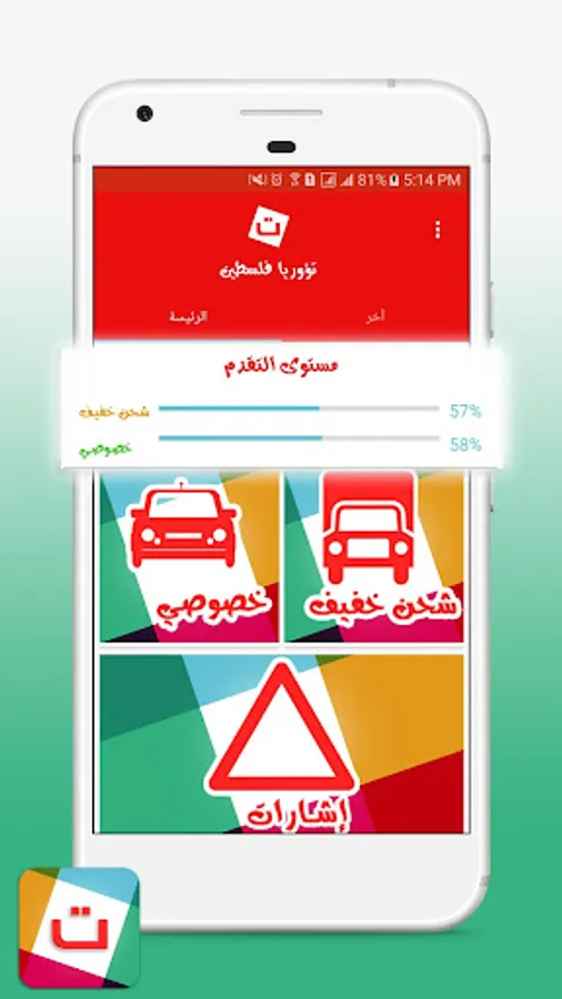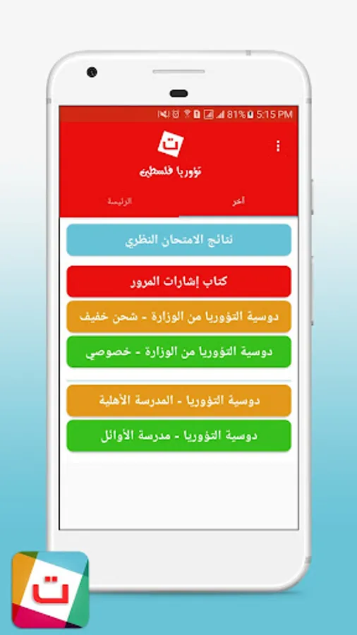 ويحتوي ايضا على صفحة نتائج الامتحان النظري في فلسطين