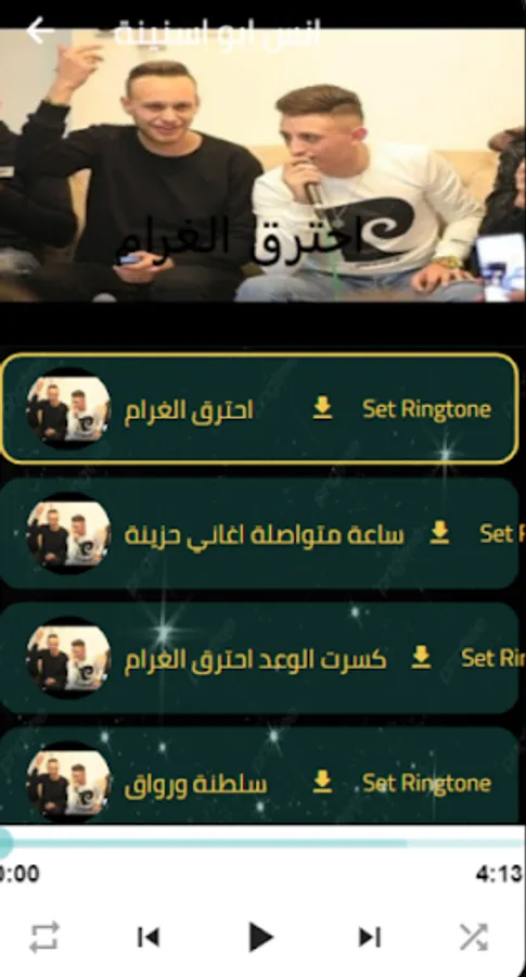This app is made by: Anas Abu Snaineh fans, and it is unofficial. The content in this app is not affiliated with, endorsed, sponsored, or specifically approved by any company. All copyrights and trademarks belong to their respective owners. The songs in this application are collected from around the web, if we are in breach of copyright, please let us know and it will be removed as soon as possible.