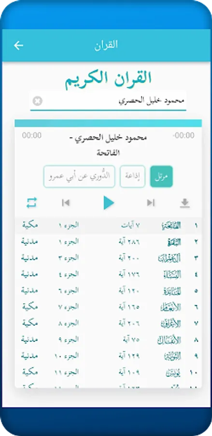 Listening to Quranic recitations: Allows users to listen to Quranic recitations by famous and distinguished reciters. Users can choose their favorite recitation and repeat the recitations for concentration and deep listening