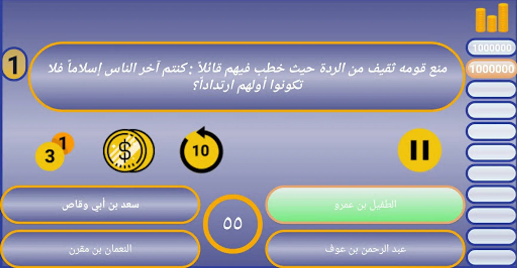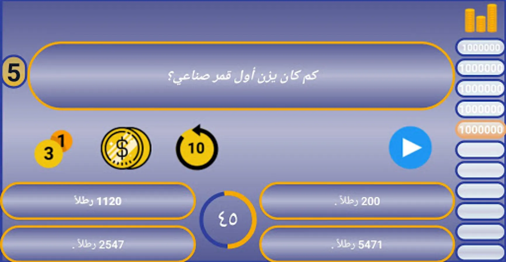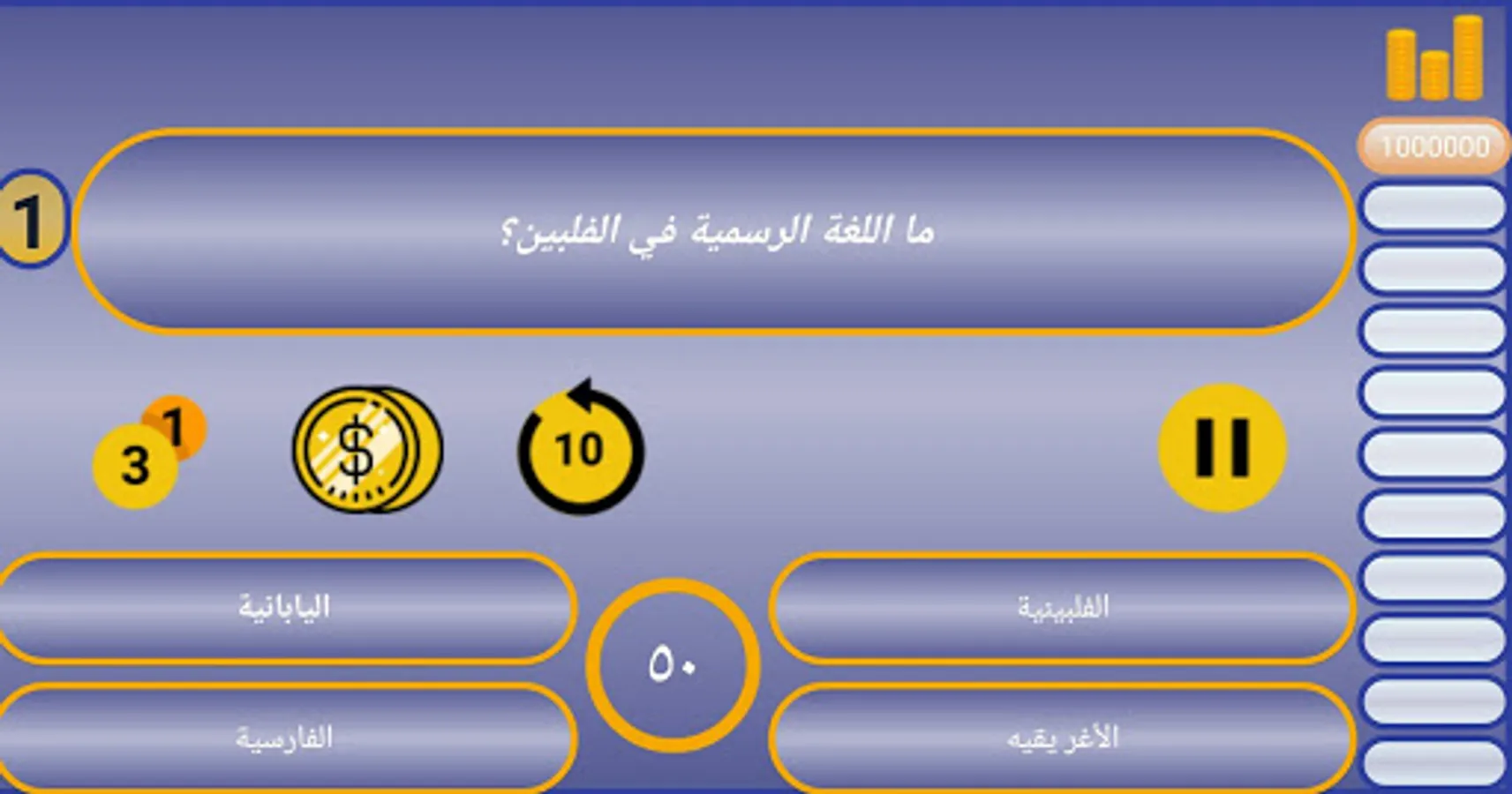 - The game consists of 10 questions starting with the first question to the tenth question worth one million.