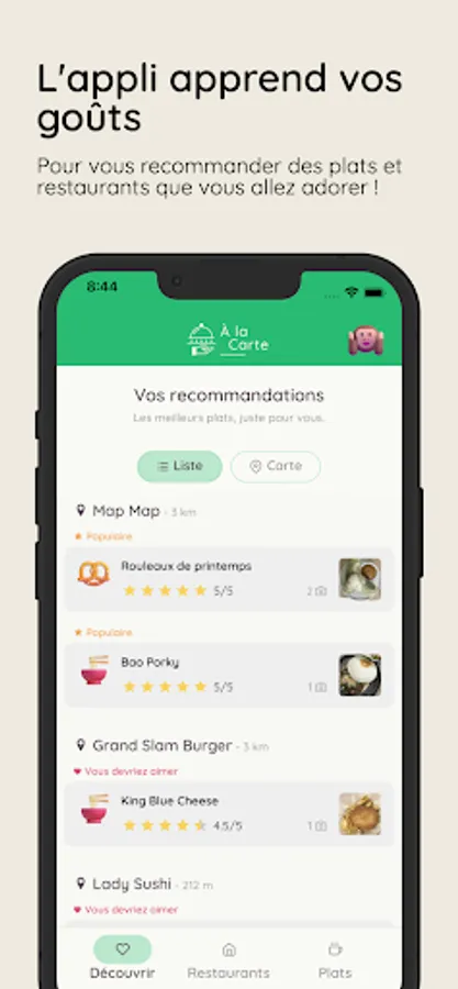 The application helps its users to find restaurants or dishes that perfectly match their tastes thanks to a rating system and personalized recommendations.
