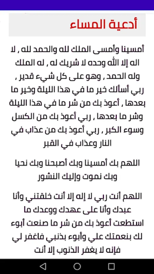 The application contains an audio reading of the correct evening remembrances from the Prophet’s Sunnah. An audio recording of Sheikh Mishary Rashid Al-Aallasi with the evening remembrances written to read it while hearing it in Aallasi’s voice.