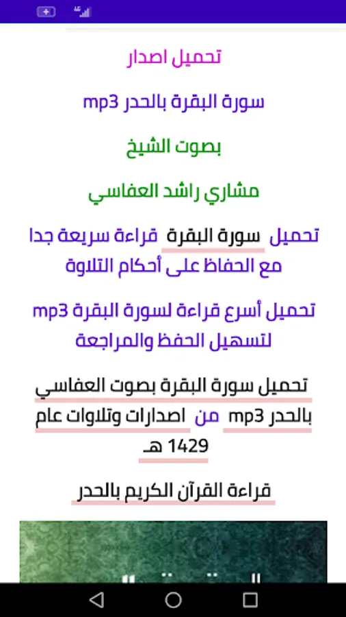 Whoever browses the application will find a large collection of recitations of Surat Al-Baqara mp3 by Mishary Al-Afasy in Tarawih prayers and Qiyam, recordings from the studio, old cassette versions, and the distinctive new recitation of Surat Al-Baqarah in the manner of zamzama mp3.