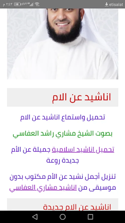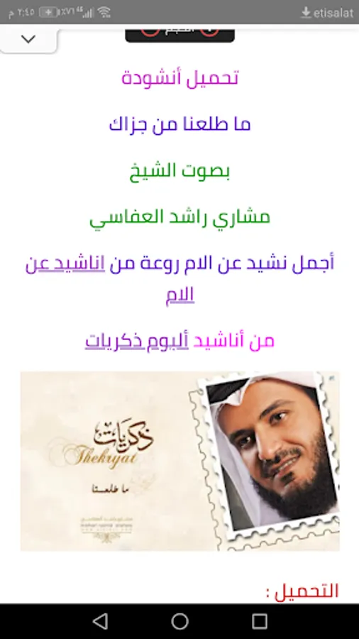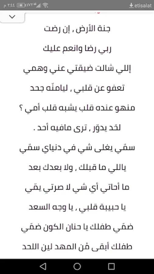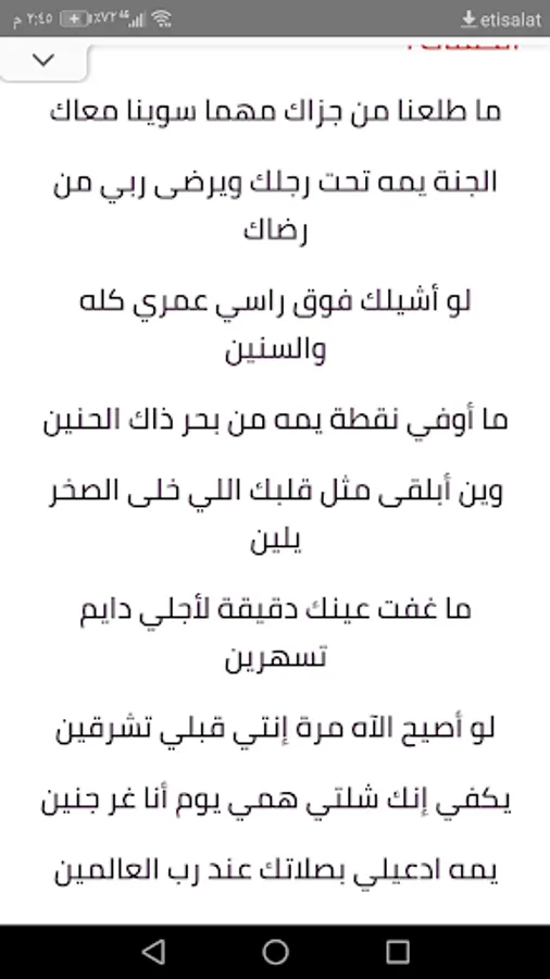 The application contains songs about the mother written in Arabic, such as the chant of what we came out of rewarding you, no matter how much we settled with you, and we praise you, I came to you, I love your hand.