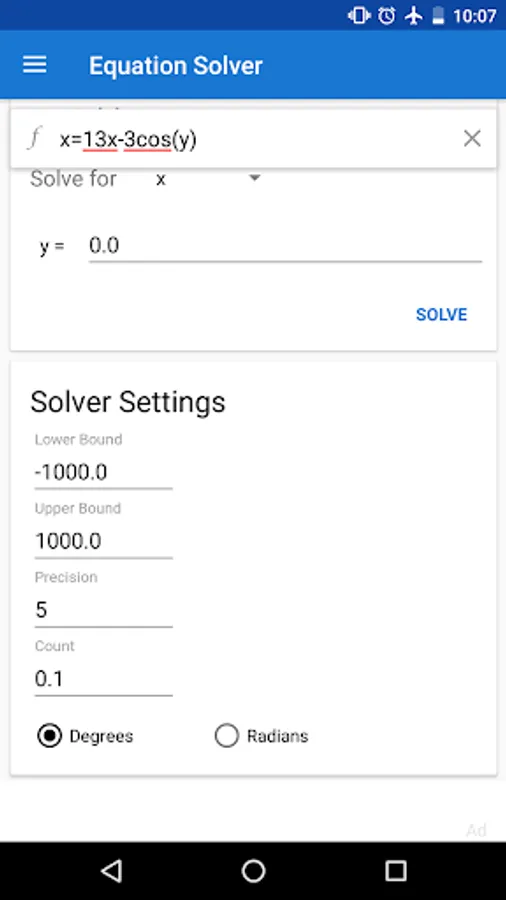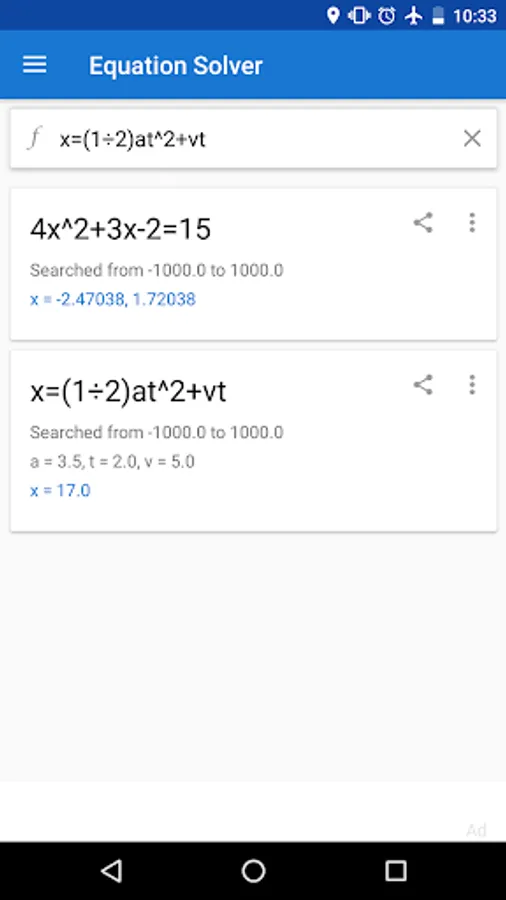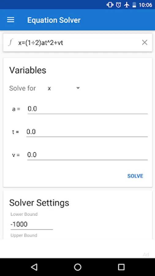 Instead of depending on hard coded formulas, Equation Solver finds the answer through a brute force method. This allows the app to solve for all sorts of problems in a relatively short amount of time!