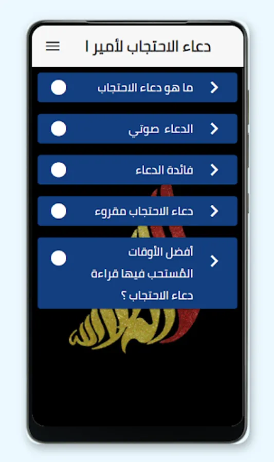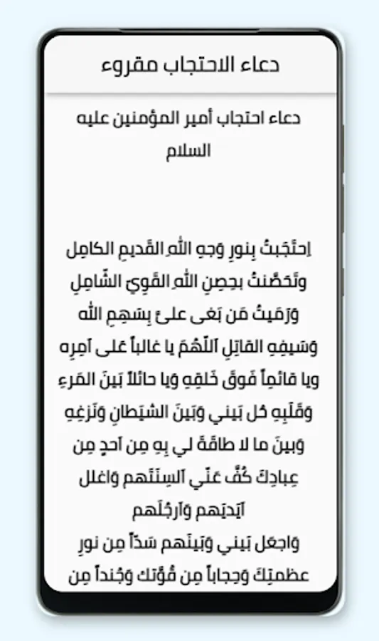 ان التطبيق دعاء الاحتجاب لامير المؤمنين يتضمن محتوى صوتي مسموع و كتابة مقروء