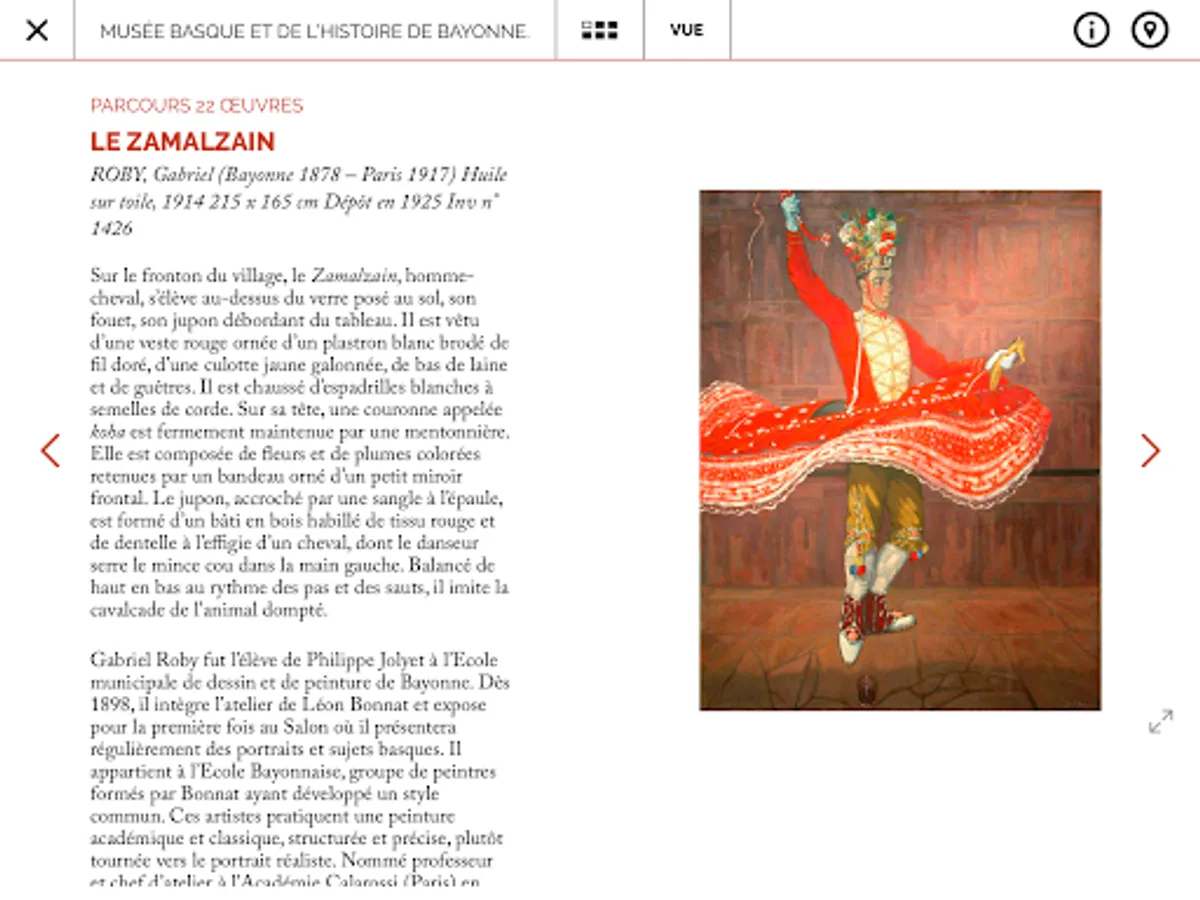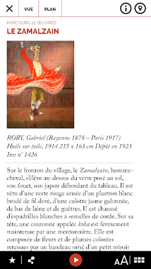 · The audio-guide function is based on the comment related to the object. This basic information allows a quick visit, which can be completed by reading the thematic panels of each room.