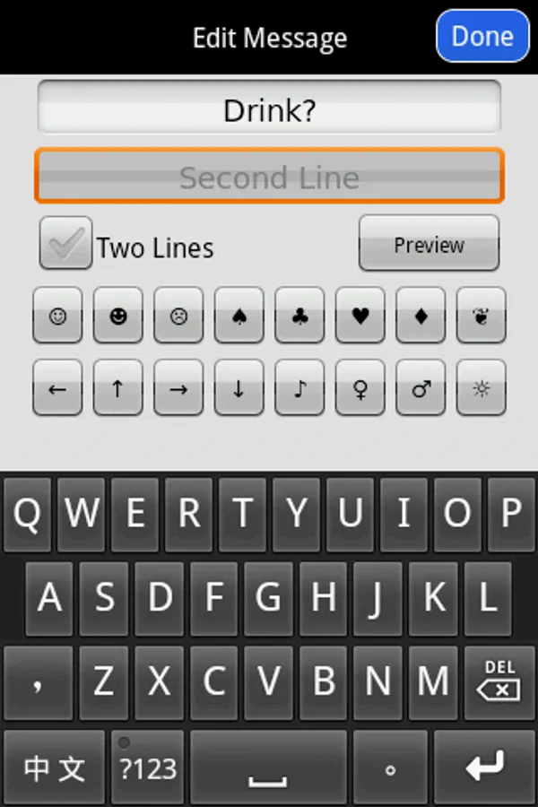 You can also enter your own messages: just press the "i" button. Messages can be entered on one or two lines and there is a selection of symbols including Smileys on the custom keyboard. Be creative and say what you really want to say.
