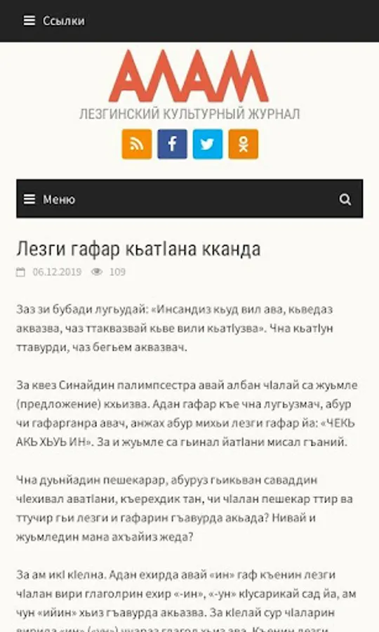 Alam is a Lezgi cultural magazine published since 2012. On the pages of the magazine you will find materials on history, culture, interviews with creative people, reviews of book novelties, authoritative opinions, scientific comments and much more.