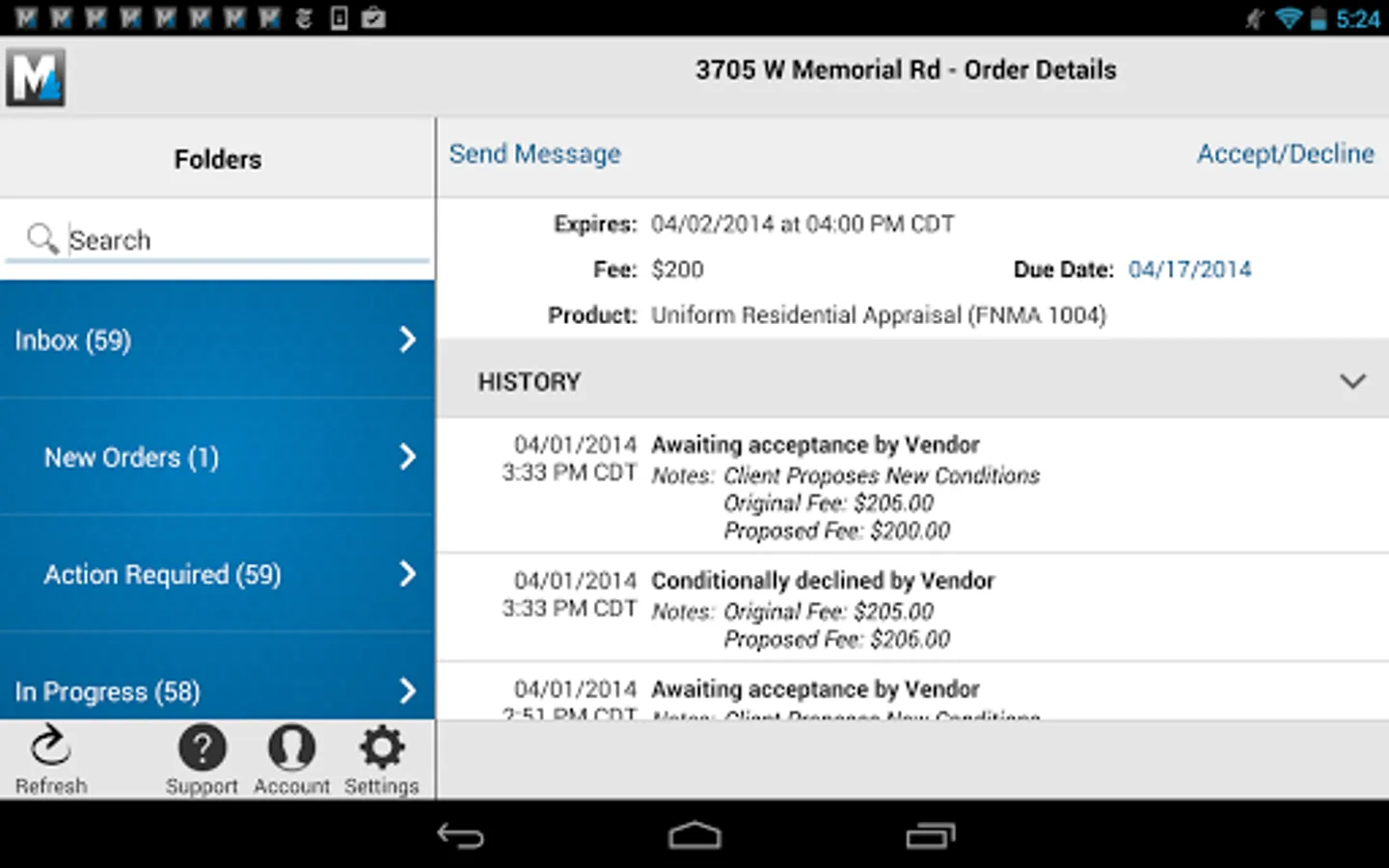 Essential for appraisers on Mercury Network, Mercury Mobile for Android is the tool you need to efficiently manage your orders, no matter where you are. With Mercury Mobile for Android, you’re given the ability to see and manage all orders in all statuses, update order statuses, send messages, and much more.