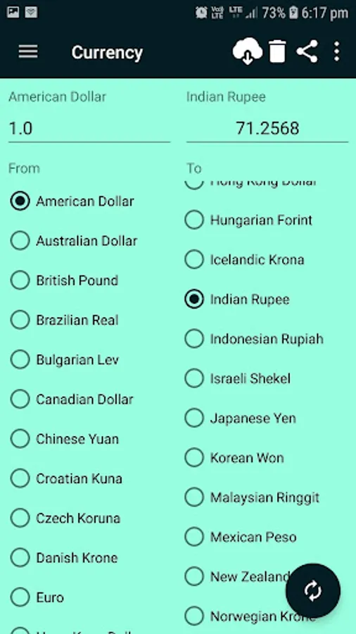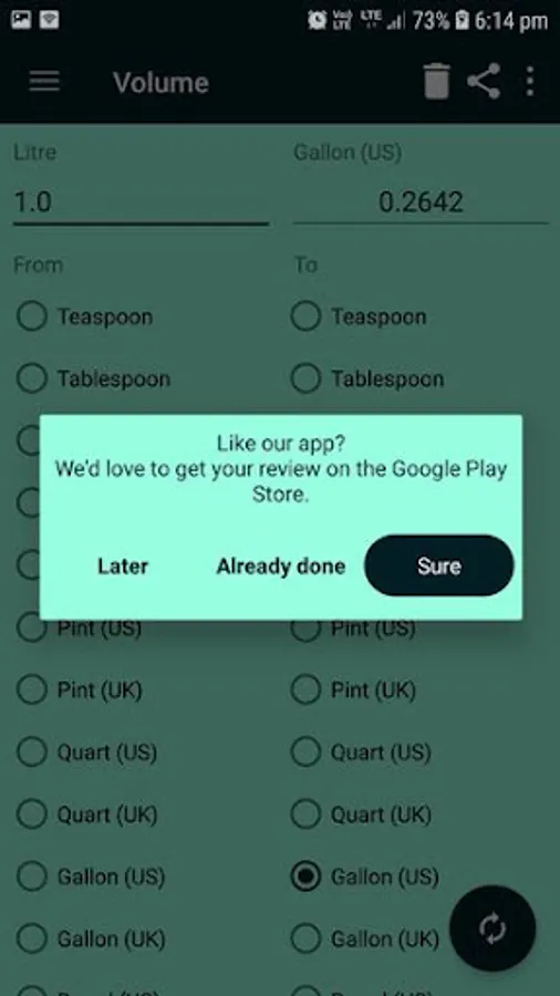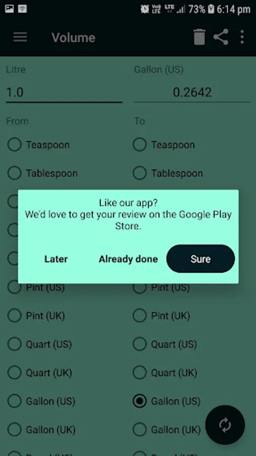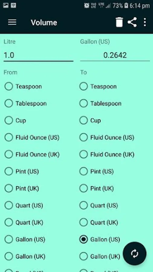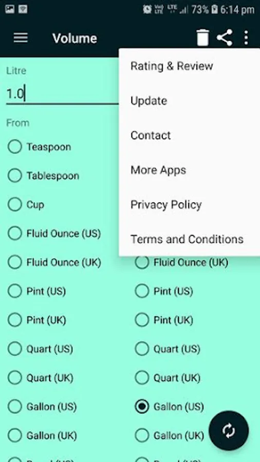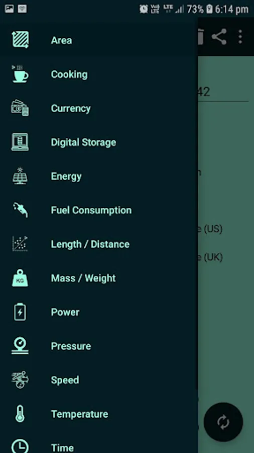 • Use the hamburger side menu for switching between conversions and select the units you require. To open the menu, swipe in from the left side of the app, or press the 3 lines hamburger in the top left corner.