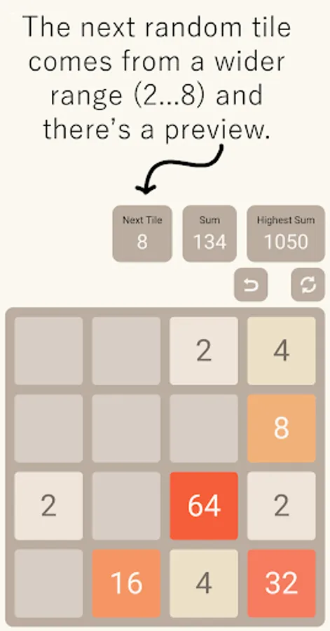 2048 tweaked to be fun from the start and a bit more like 3s. A unique challenge that requires different techniques to win than either 2048 or 3s. No annoying ads, runs without internet connection. No tracking, no questionable permissions, and no oversized download.