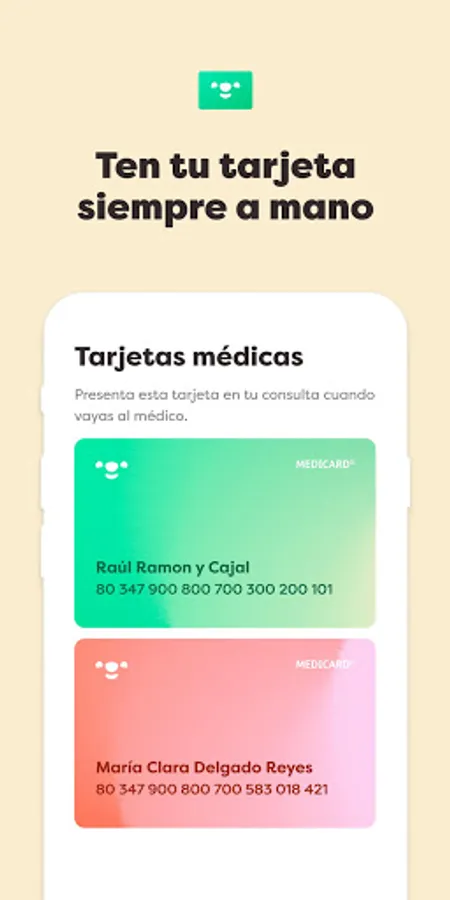 - Access your medical card (and those of your family) in digital format to always have it at hand (we will also send you a physical card).