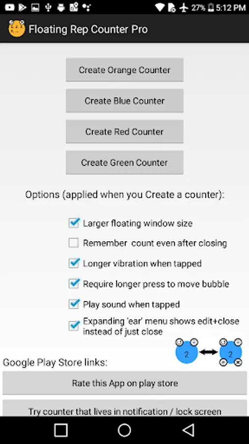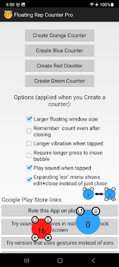 Keep count of your reps while exercising, or any other kind of tally, while still using your phone to browse the web, watch youtube, or anything else you want. Tiny window covers very little space, but offers all the features you need in a counter.