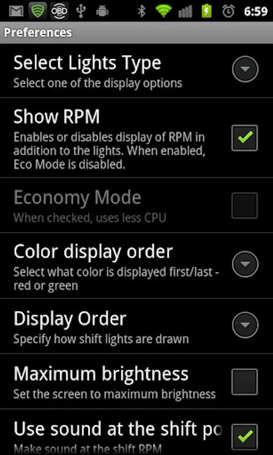 The first 3rd party plug-in for the amazing Torque Pro. Shows the shifting points in 5 different ways - LEDs, bars, entire screen, wave and a sudden flash.
