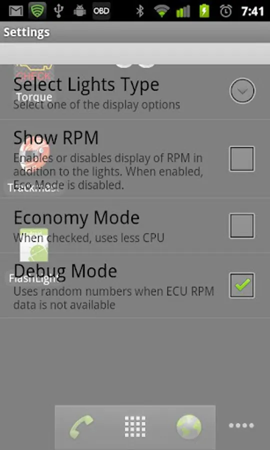 Double-tap your screen to bring up the preferences. Options include four different ways to display the lights (LEDs, Bars, Entire Screen, Sudden Flash), option to show RPMs and Debug mode (for when you are not connected to your ECU).