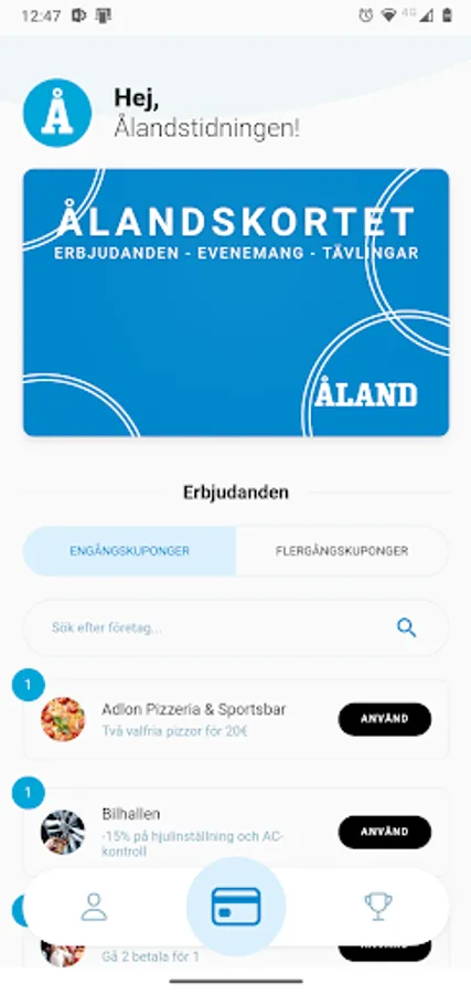 The new digital Åland card is filled with benefits from shops and restaurants as well as various events and competitions. You can easily take advantage of the benefits of all participating companies. The Åland card is exclusive to Ålandstidningen's readers. To gain access to the benefits, you must be a continuous subscriber and you log in with your user information. The Åland card app is free!