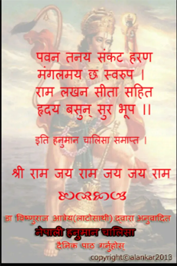 Nepali Hanuman Chalisa is a devotional prayer based on Lord Hanuman. It was originally written by Tulsidas in the Awadhi language. Prof. Dr. Vishnu Raj Atreya, a sanskrit scholar and also a hanumanji devote thought of translating this prayer in Nepali language so that the Nepali can pray Lord Hanuman in their own native language.