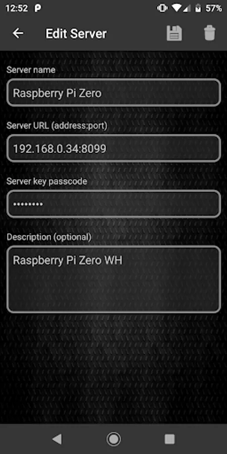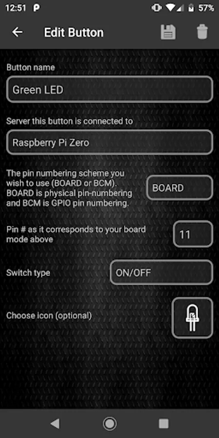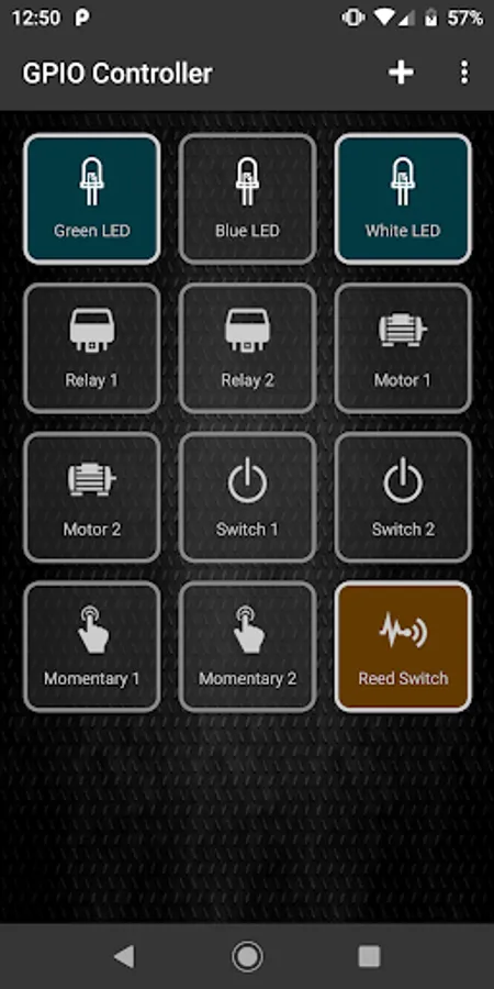 With this app and GPIO Server, you can remotely control your Raspberry Pi's GPIO pins using your Android device. You can create virtual buttons, which you can use to control physical relays, switches, etc. on your Raspberry Pi.