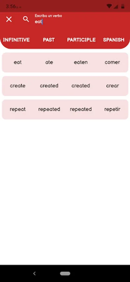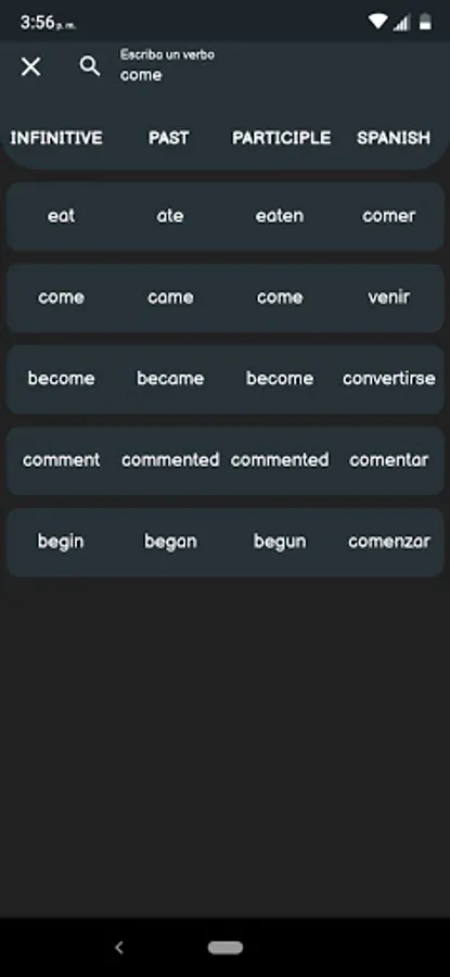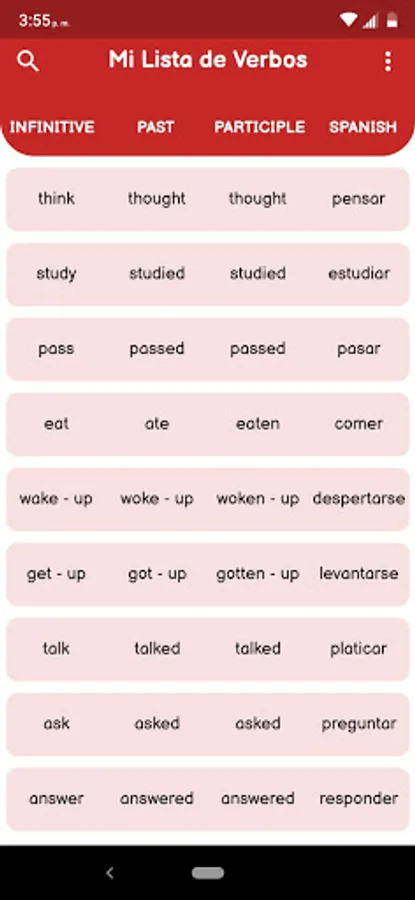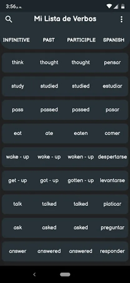 A list of 159 verbs in English and Spanish with infinitive, past and participle tenses.