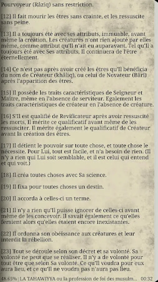 Translation of an ancient work written there 11 century in Arabic and which deals with an important and delicate religious subject. This is the aqeedah did Tahawiyya, where the author, Abu Ja'far At-Tahawi (He was born in 239 and died in 321 AH) describes the fundamentals of the faith and religion of Muslims .