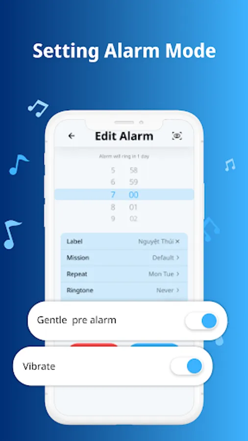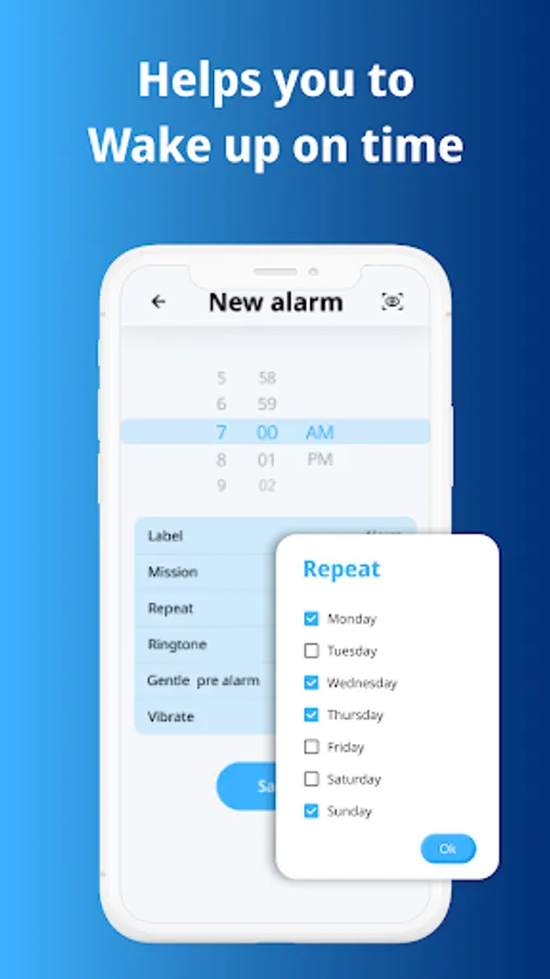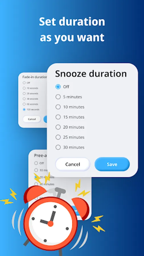 ✔ Select and custom alarm: Snooze, free-alarm, fade-in duration