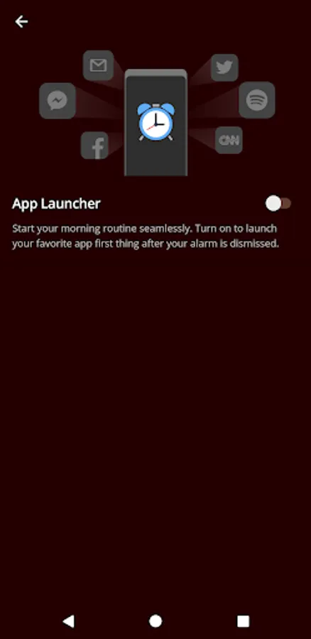 App Launch — Choose an app on your device that will launch after you turn off your alarm.