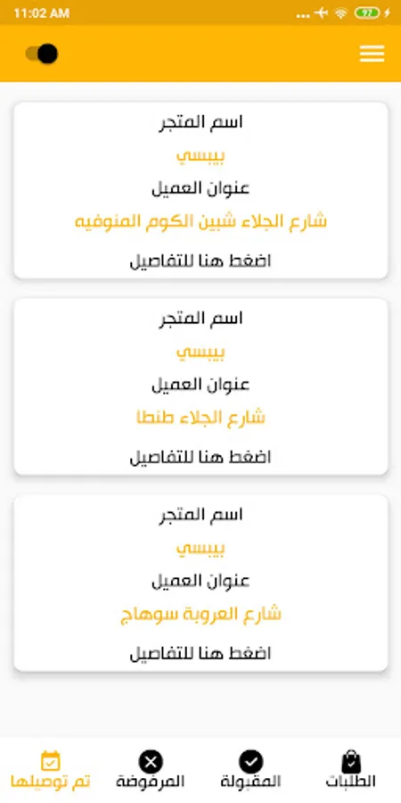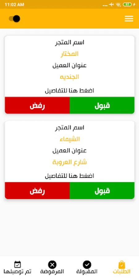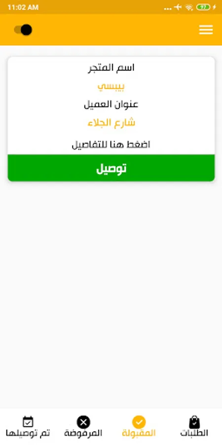 عند فتح التطبيق يقوم بالانتقال بك لصفحة الطلبات لتقوم بقبول الطلب او رفضه عند قبول الطلب ينتقبل الطلب الي الطلبات المقبوبة ولابد من تنفيذه ليرسل الي الطلبات المكتملة يمكنك ايضا تفعيل خاصية الاون لاين و الاوف لاين لتقوم بقبول الطلبات ام لا
