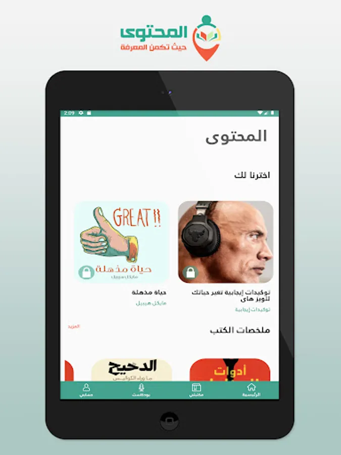 The content provides audio summaries of the best-selling books in the world and the Arab world in a professional manner. You can listen to audio book summaries that contain the focused interest from the book, giving you the best of the book in a short period of time. It also offers another set of useful audio content sections for the Arab listener, and the application also allows you to listen and download books without the Internet