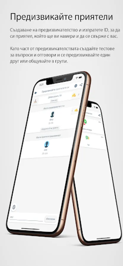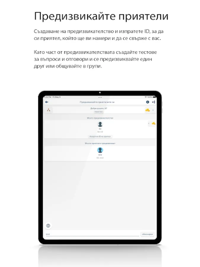 Create a challenge and send the ID to a friend who will find you and contact you. As part of the challenges, create question and answer tests and challenge each other or communicate in groups.