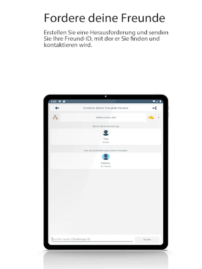 Create a challenge and send your friend ID, which he will use to find and connect with you. Create quizzes with questions and answers within challenges and challenge each other or communicate with each other in groups.
