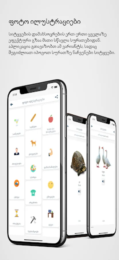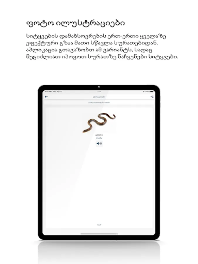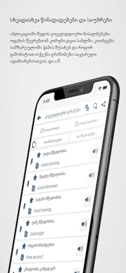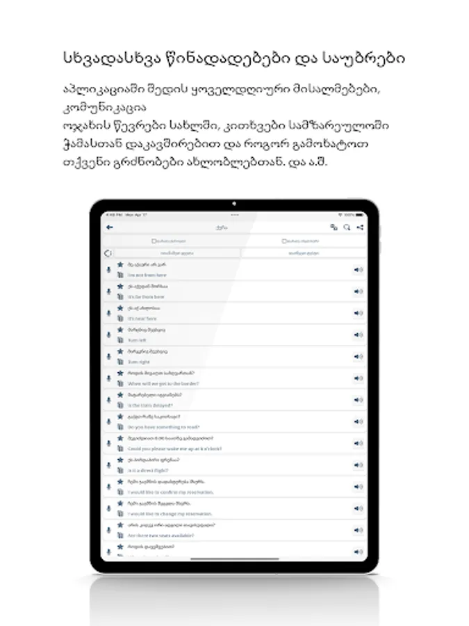 Bilingual dictionary: inside our app, a Georgian-English dictionary helps you quickly look up words and phrases.