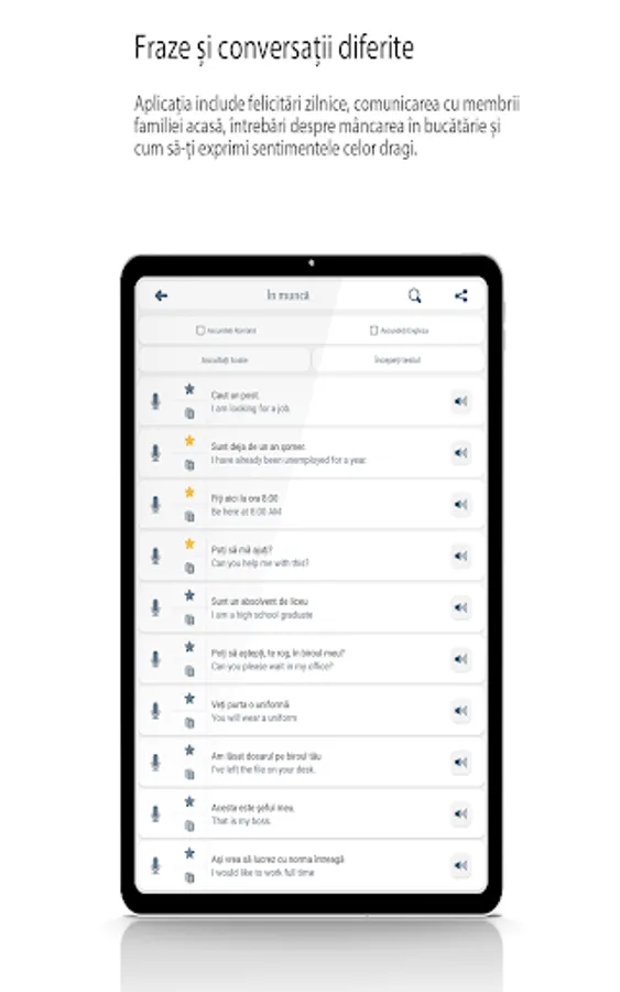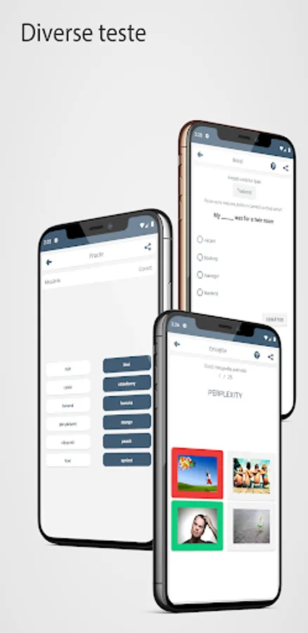 Test your knowledge on different types of tests offered by the app, such as: connecting words that have the same meaning, finding the correct answer from the picture, translating the word or sentence, listening to the sentence and then writing it, pronouncing the sentence that appears, and others.
