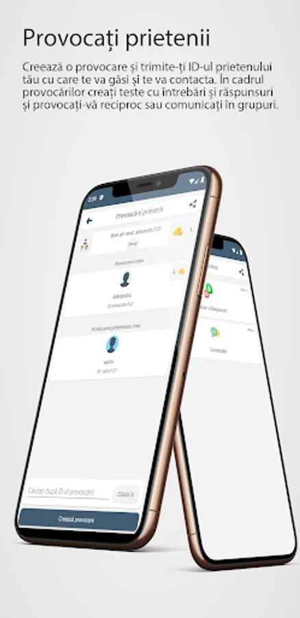 Create a challenge and send your ID to your friend who will find and contact you. In challenges create quizzes with questions and answers and challenge each other or communicate in groups.