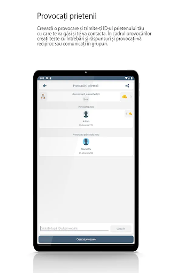 Create a challenge and send your ID to your friend who will find and contact you. In challenges create quizzes with questions and answers and challenge each other or communicate in groups.