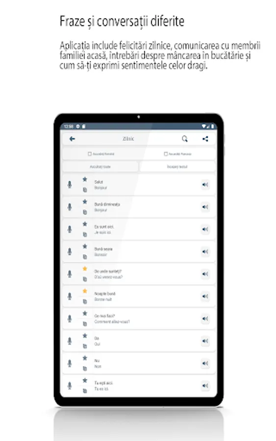 -Practice reading, speaking, listening and writing. The application also offers the possibility to listen to the sentence aloud from French speakers.